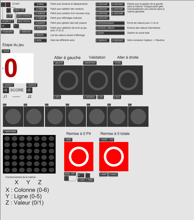 L’idée de notre projet découle de deux envies plutôt simples de notre part. La première étant de recréer un jeu de société de notre enfance. Et puis la seconde vient de la découverte de la possibilité d’utiliser des matrices dans Max MSP et notre envie d’explorer la fonctionnalité. Ainsi c’est tout naturellement que l’idée d’un Puissance 4 revisité au format numérique nous est apparu. Le fonctionnement du jeu est réalisé sur différents patchs max reliés entre eux. Le jeu requiert deux matrices, chacune associée à un des deux joueurs.
